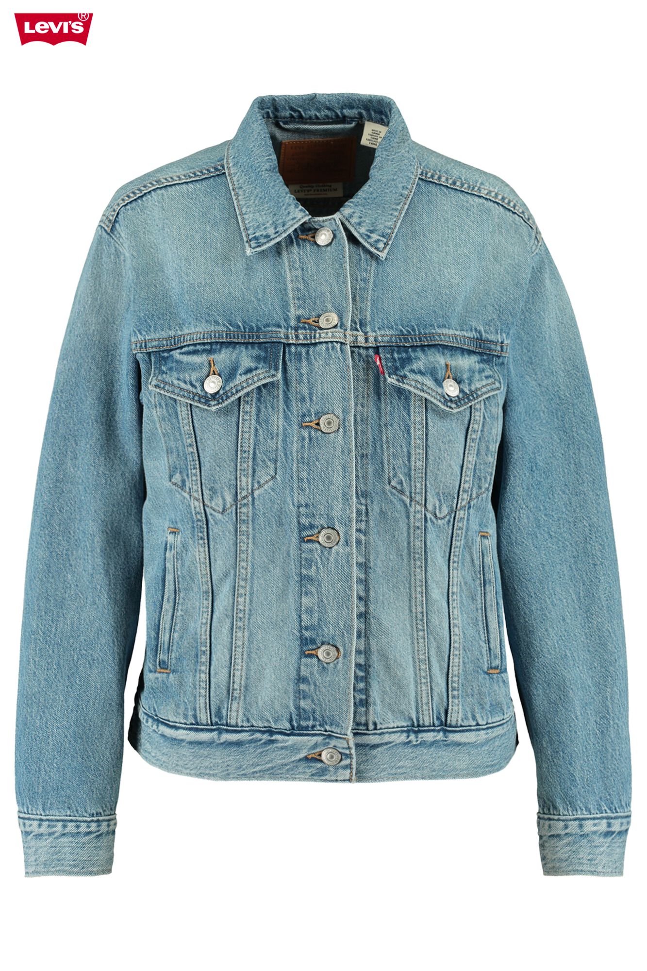 Layer up your look with the Levi's Trucker short jean jacket This women's jean jacket sports a slightly cropped length for a modern silhouette In addition, this women's light blue jean jacket comes with a fold over collar, long sleeves, buttonflap chest pockets As well as welt hand pockets, singlebutton cuffs, and straightcut front and back yokes.